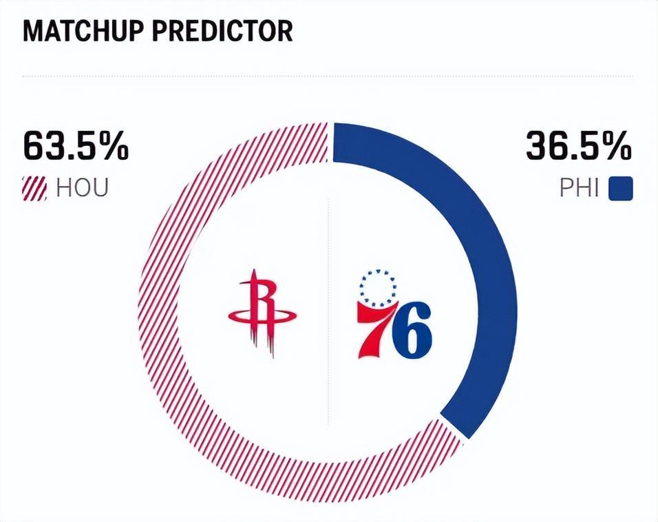 赛前,美媒ESPN对本场比赛进行了胜率预测,火箭队胜率依旧高达63.5% ,占据绝对上风,76人胜率则仅有36.5%,还是不被看好。